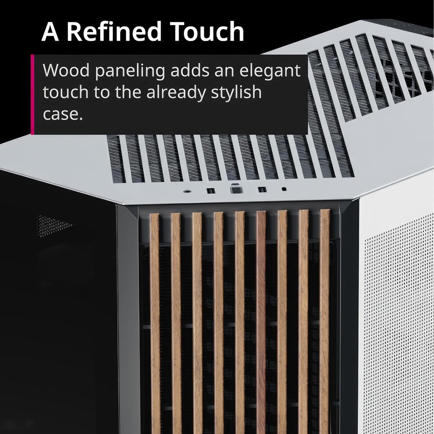 Dual Chamber Panoramic View Structure With 45° Angular Front Intake Design - Enhances overall airflow efficiency for both GPU and CPU, while providing a sleek and organized appearance. Angular front intake panel accommodates up to 3 x 12cm, 2 x 14cm, or 2 x 16cm fans, offering flexibility for optimal cooling configurations.