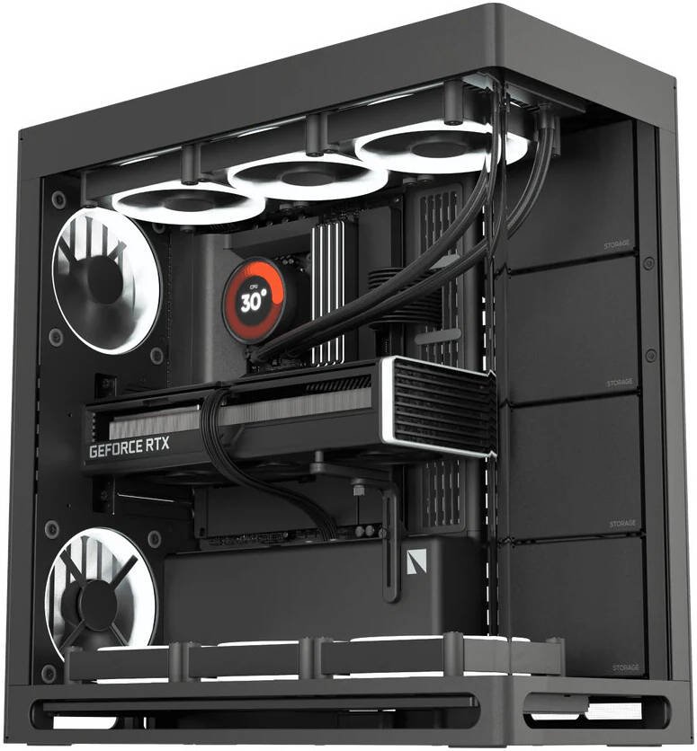 Specifications Form Factor Mid Tower Material SGCC sheet metal, tempered glass, ABS, Nylon, Silicon, Zinc alloy, NdFeB magnets PC Case Dimensions 541 x 259.5 x 547 mm Net Weight 17.84 kg Front I/O USB 3.2 Gen 2 Type-C x1 USB 3.2 Gen 1 Type-A x2 Audio Jack x1 Power & Reset Button x1 Motherboard Support E-ATX (Max Width 277 mm) / ATX / M-ATX / Mini-ITX Expansion Slots 6 Fan Support Maximum Amount: 11 Top: 3 x 120 / 3 x 140 mm Right: 3 x 120 / 3 x 140 mm Bottom: 3 x 120 / 3 x 140 mm Rear: 2 x 120 / 2 x 140 mm (Thickness Up to 30 mm) Fan PWM Repeater Channel: Total 12 ch Location: Cable Management Tray x1, PSU Shroud x1 CPU Tower Cooler Clearance Up to 185 mm Liquid Cooling Support Top: 280 / 360 / 420 mm (Thickness: 65 mm, not overlapping with RAM) Right: 280 / 360 / 420 mm (Thickness: 60 mm w/ GPU >317mm, 80 mm w/ top AIO) Bottom: 280 / 360 / 420 mm (Thickness: 120 mm) Graphics Card Clearance Length: Up to 480 mm Width: 195 mm GPU Support 2 - 5 Slots RAM Clearance If radiator thickness > 65 mm: 420 mm - 32 mm / 360 mm - 43 mm Power Supply Support ATX / SFX / SFX-L PSUs Length: Up to 220 mm (Clearance - 290 mm) Storage Right Fan Mount: 4 Storage Bays: 4 x 3.5'' / 8 x 2.5'' Cable Management Tray: 1 Storage Bay: 1 x 3.5'' / 2 x 2.5'' Storage Bay Included 4x Internal Display Support VESA Mounting: 75 x 75 mm / 100 x 100 mm Display Size: 14 in. (Max) Location: Front Right Pillar Dust Filter Bottom: 1 (Removable) Top: 1 (Built-in) Right: 1 (Built-in) Rear Bottom: 1 (Removable)