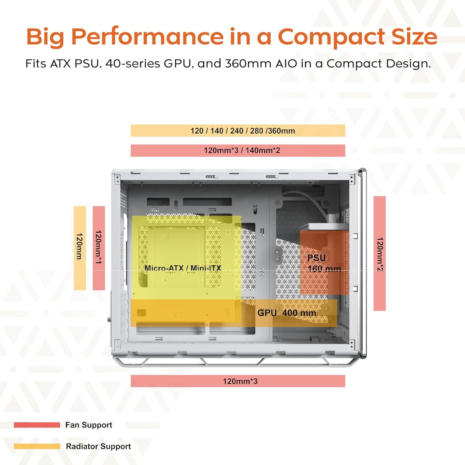 Compatible Devices ‎Micro-ATX/Mini-ITX motherboards, ATX PSU, RTX 40 Series GPUs, 360mm AIO cooling