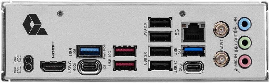 Back Panel Ports Clear CMOS Button, Flash BIOS Button, USB 40Gbps Type-C, HDMIâ„¢, 5G LAN, Audio Connectors, USB 2.0/5Gbps/10Gbps/20Gbps Type-C