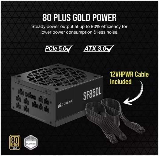 Description for Corsair SF850L SF-L Series Fully Modular Power Supply, Low-Noise SFX, 850 Watts Power, 12mm Fan Size, Gold 80 Plus Efficiency, Zero RPM Mode, Black | CP-9020245-UK