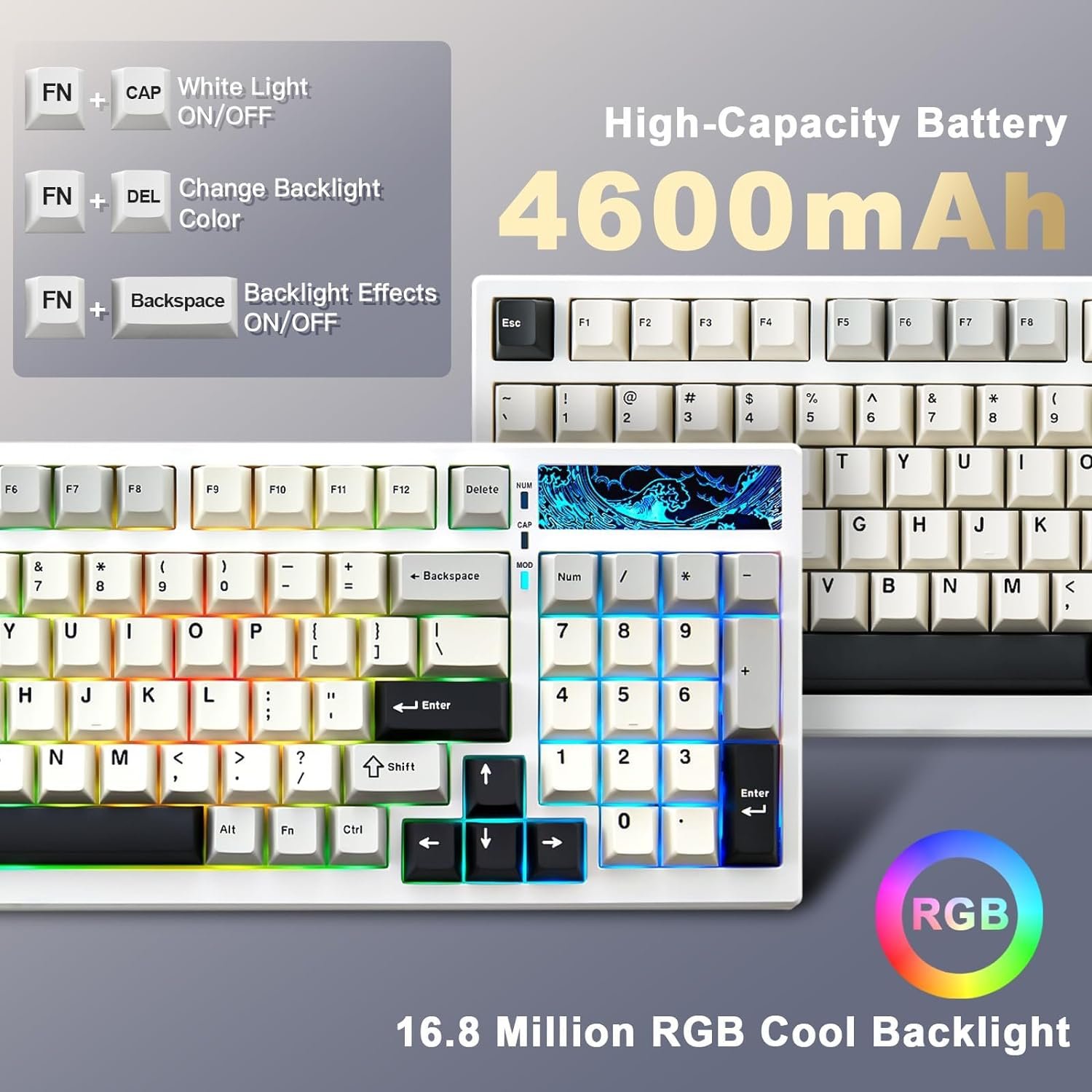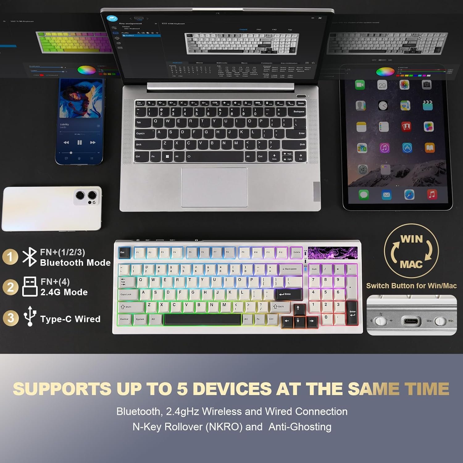 ã€Tri-mode Wireless Connectivity + Multi-Device Connection】Built-in 4600mah large-capacity battery , the YZ98 wireless keyboard has Blutooth, 2.4gHz wireless and wired connection. Compatible with Laptop, iPad, IOS, Windows, Mac or Android. No fussy connection process, the wireless connection is quick and stable. The fast 2.4gHz wireles mode has the polling rate up to 1000hz.